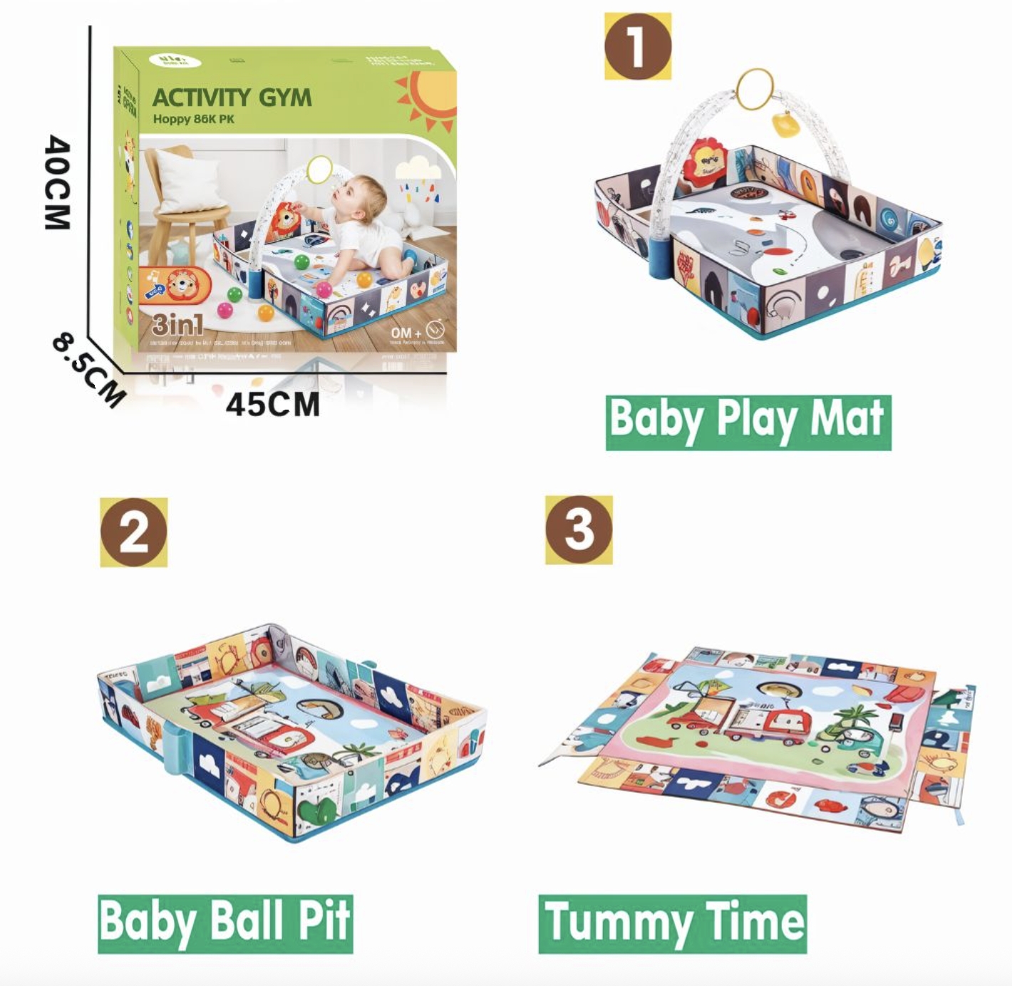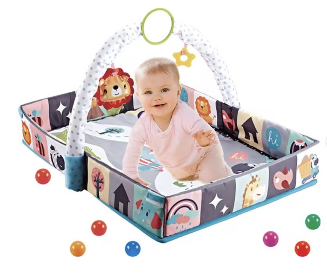 Convierte el juego de tu hijo en una experiencia emocionante con esta alfombra de juego 3 en 1 con Aro y Juguetes.