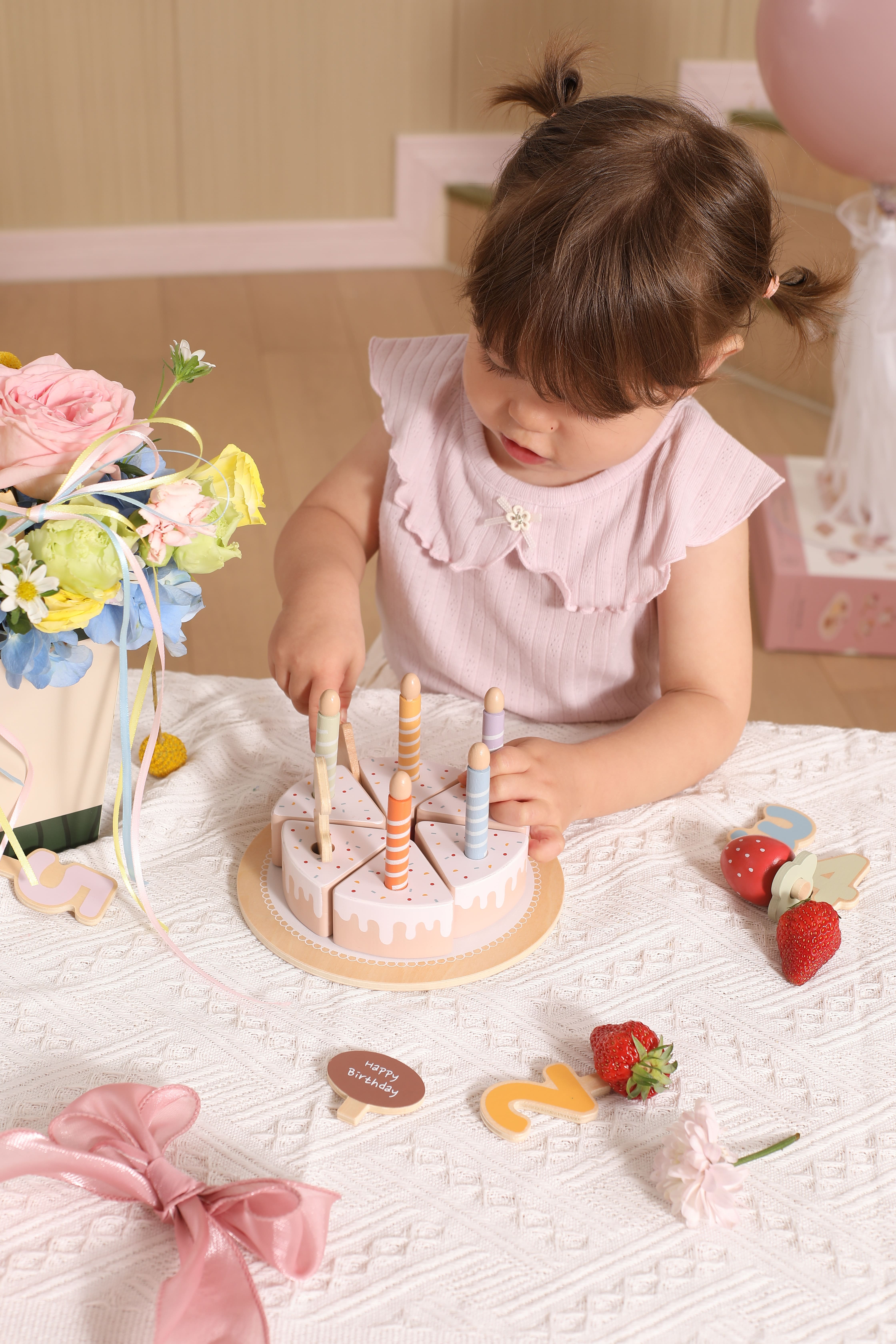 Este delicioso set de pastel de madera incluye 6 porciones de pastel, 5 bloques numéricos, velas removibles, una frutilla, un topper de chocolate, plato de pastel y espátula.