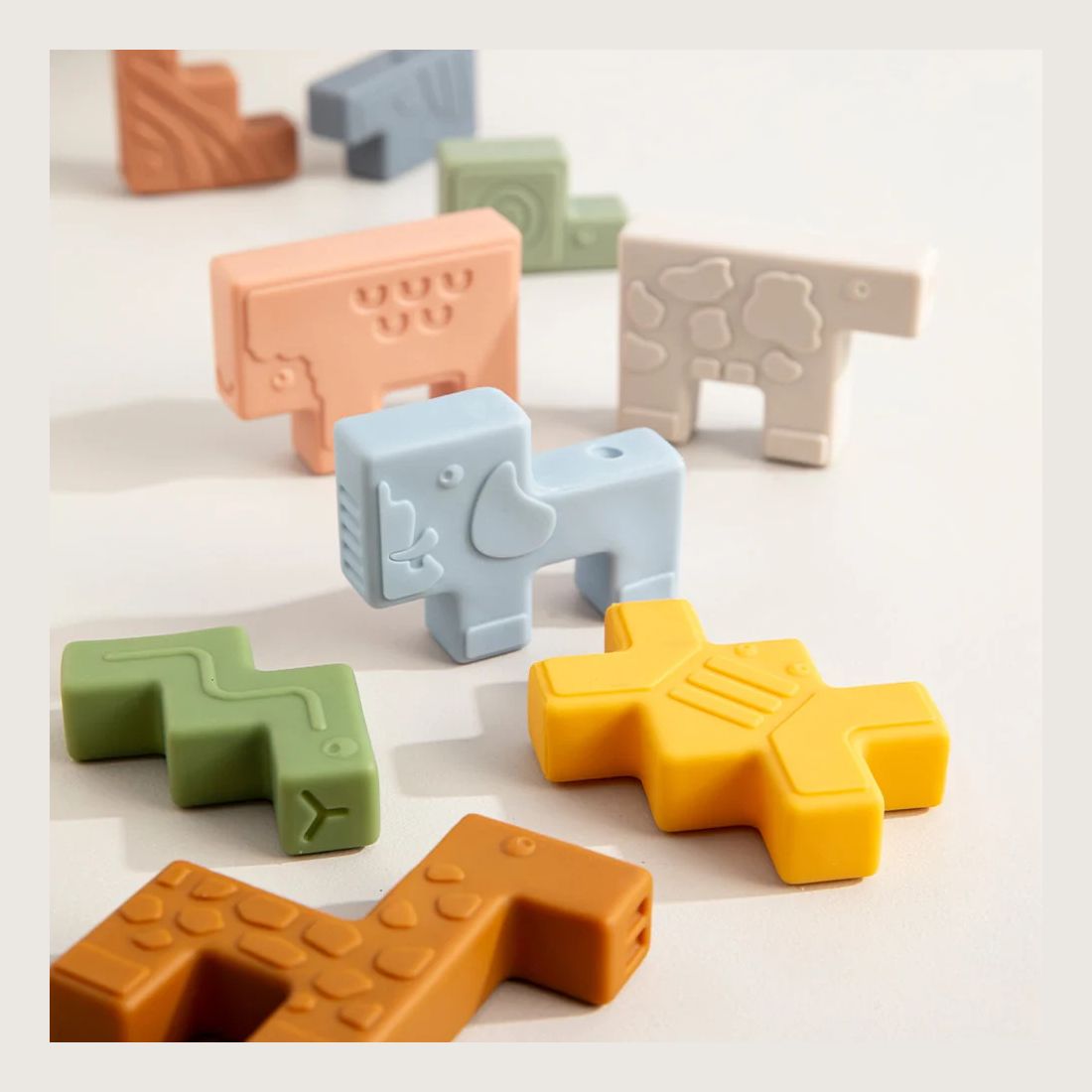 Set de 10 bloques con diseños de animales, ideales para estimular el desarrollo temprano a través del juego.