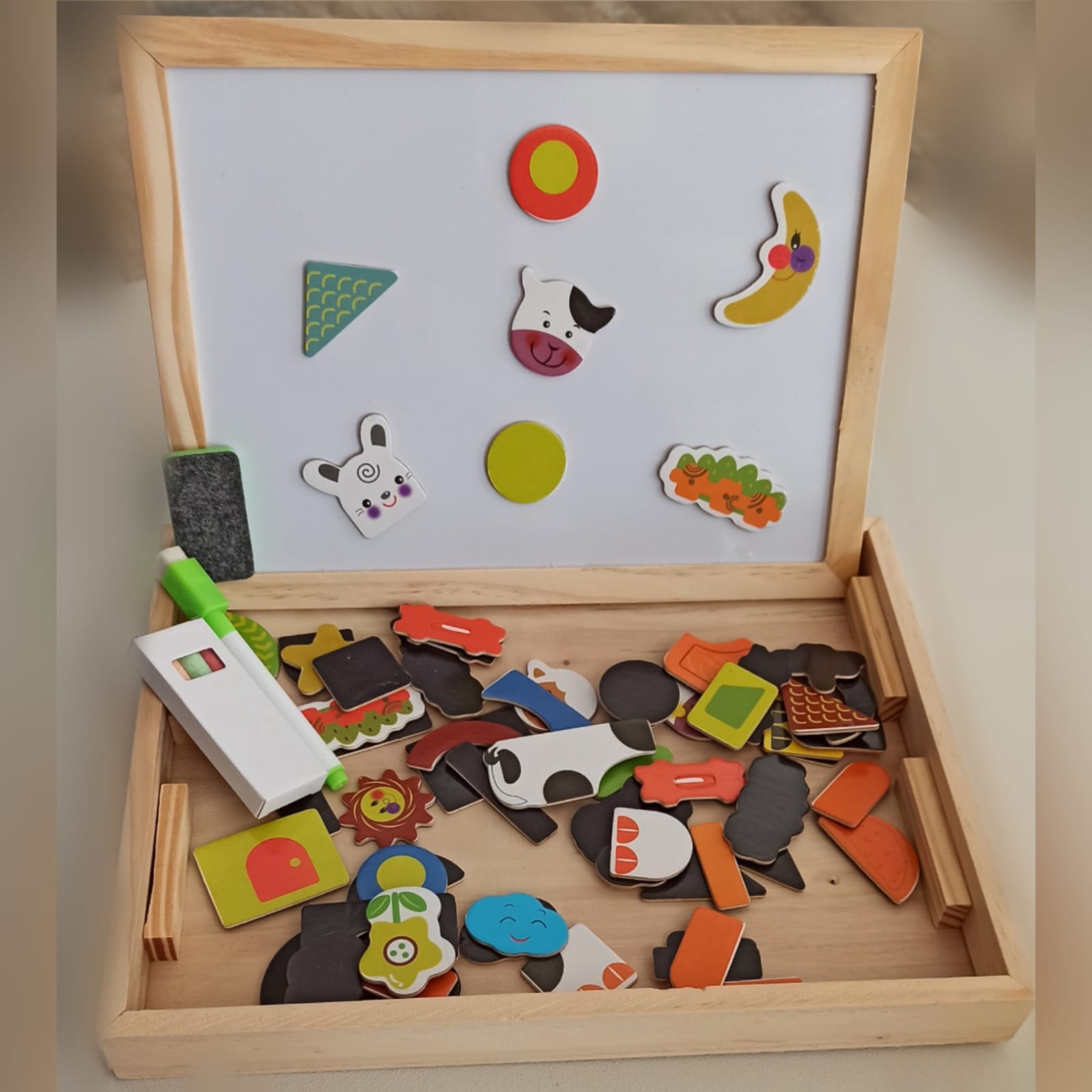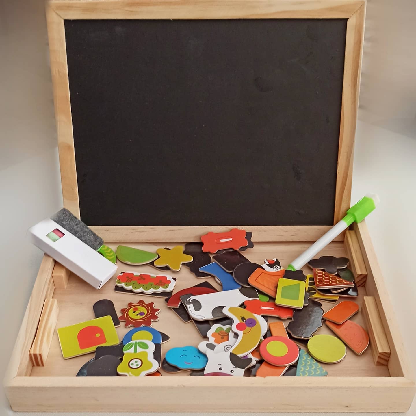Contiene: 95 Piezas Aprox. 1 marcador de pizarra. 1 Borrador. 3 Tizas de colores.