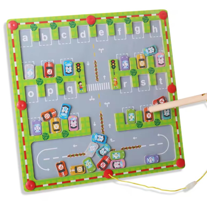 Hecho de madera dura, este laberinto magnético está decorado con autos coloridos, cada uno representa una letra del alfabeto. Los niños pueden utilizar la varita magnética incluida para guiar hábilmente cada automóvil en su lugar, aprendiendo el reconocimiento de letras y el orden alfabético mientras disfrutan del juego.