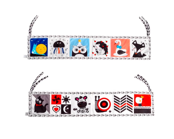 Lado 1: Colores de alto contraste. Estimulación visual simple. Ayuda a desarrollar los sentidos y la inteligencia emocional del bebé.