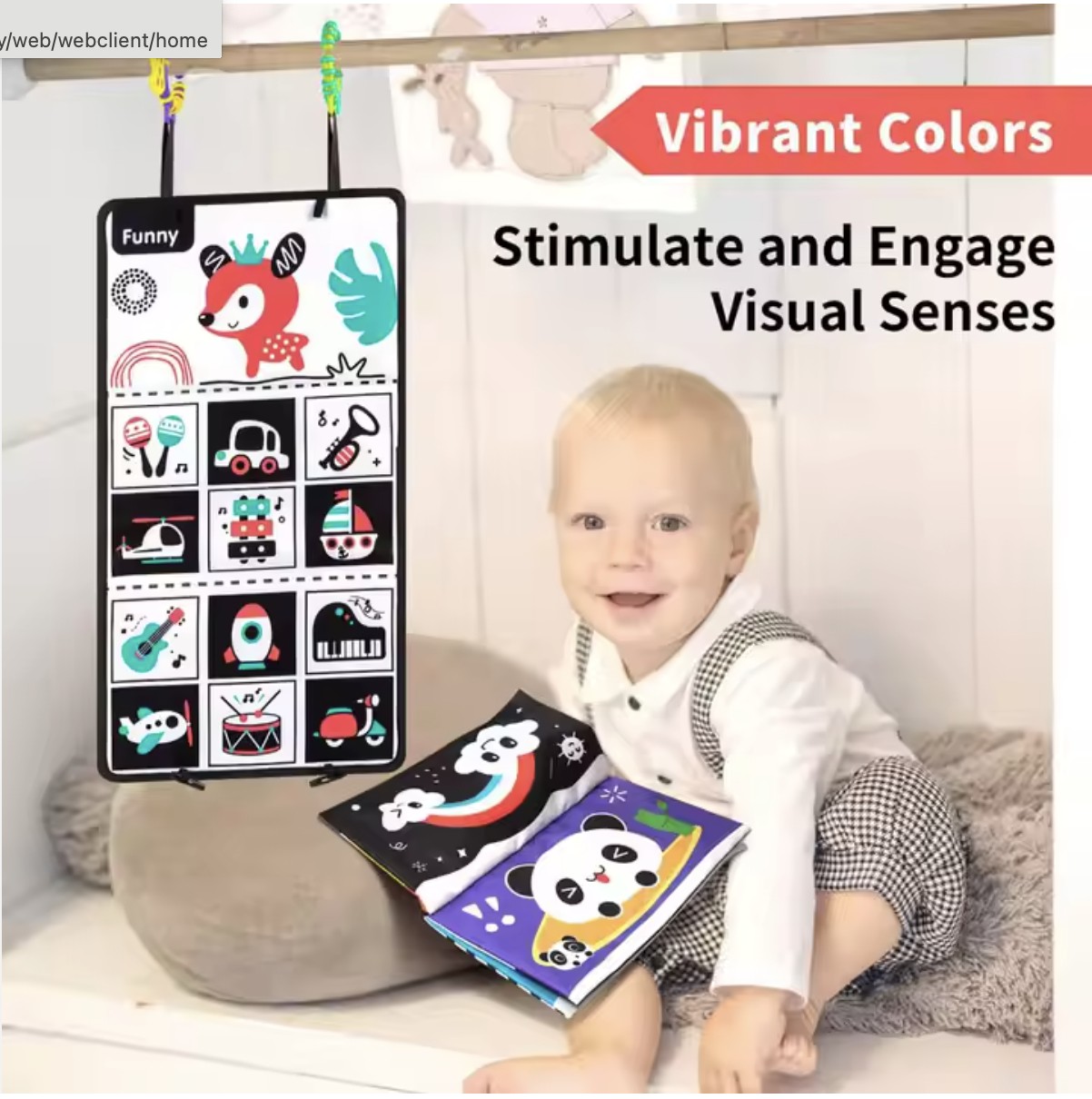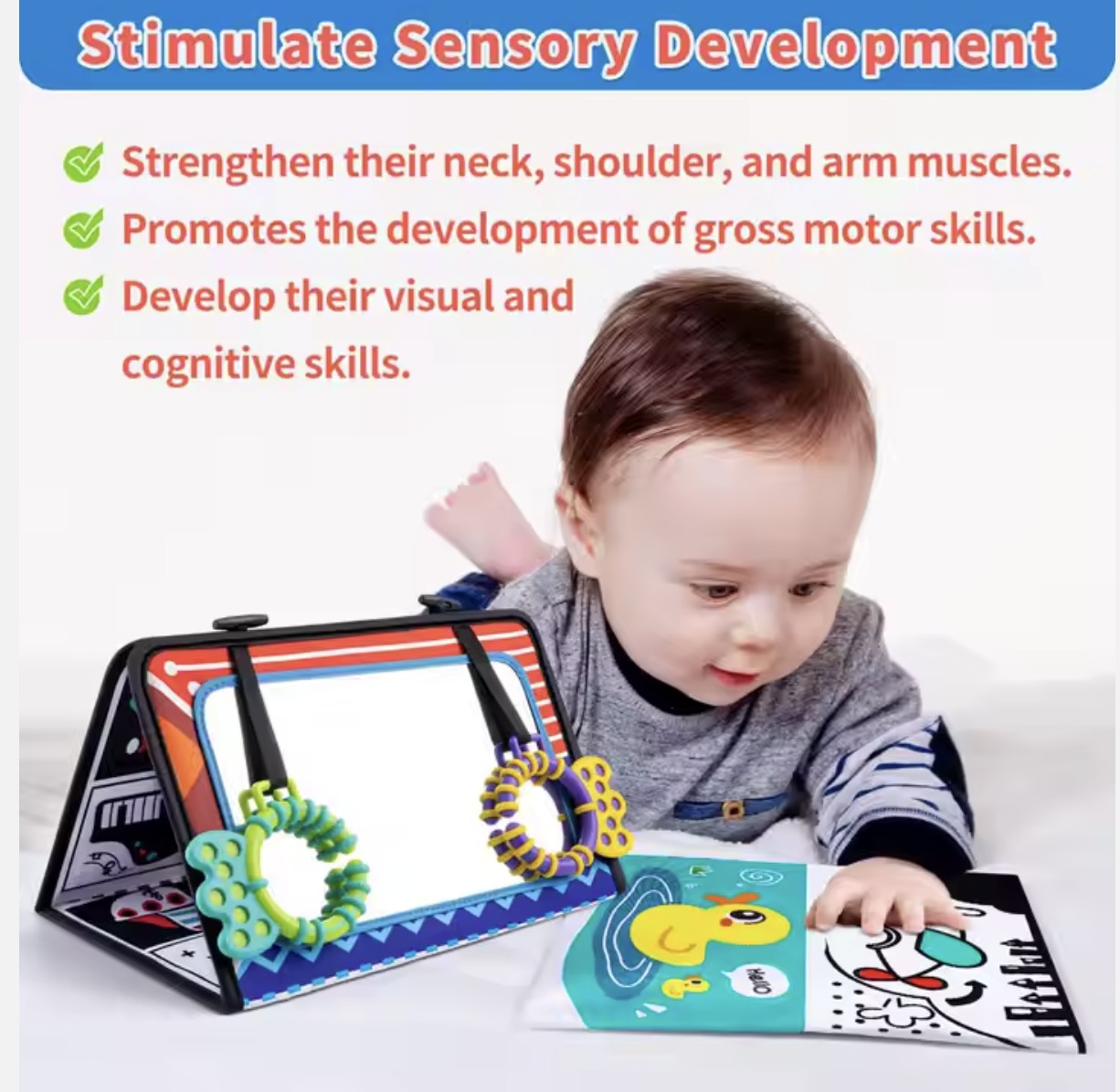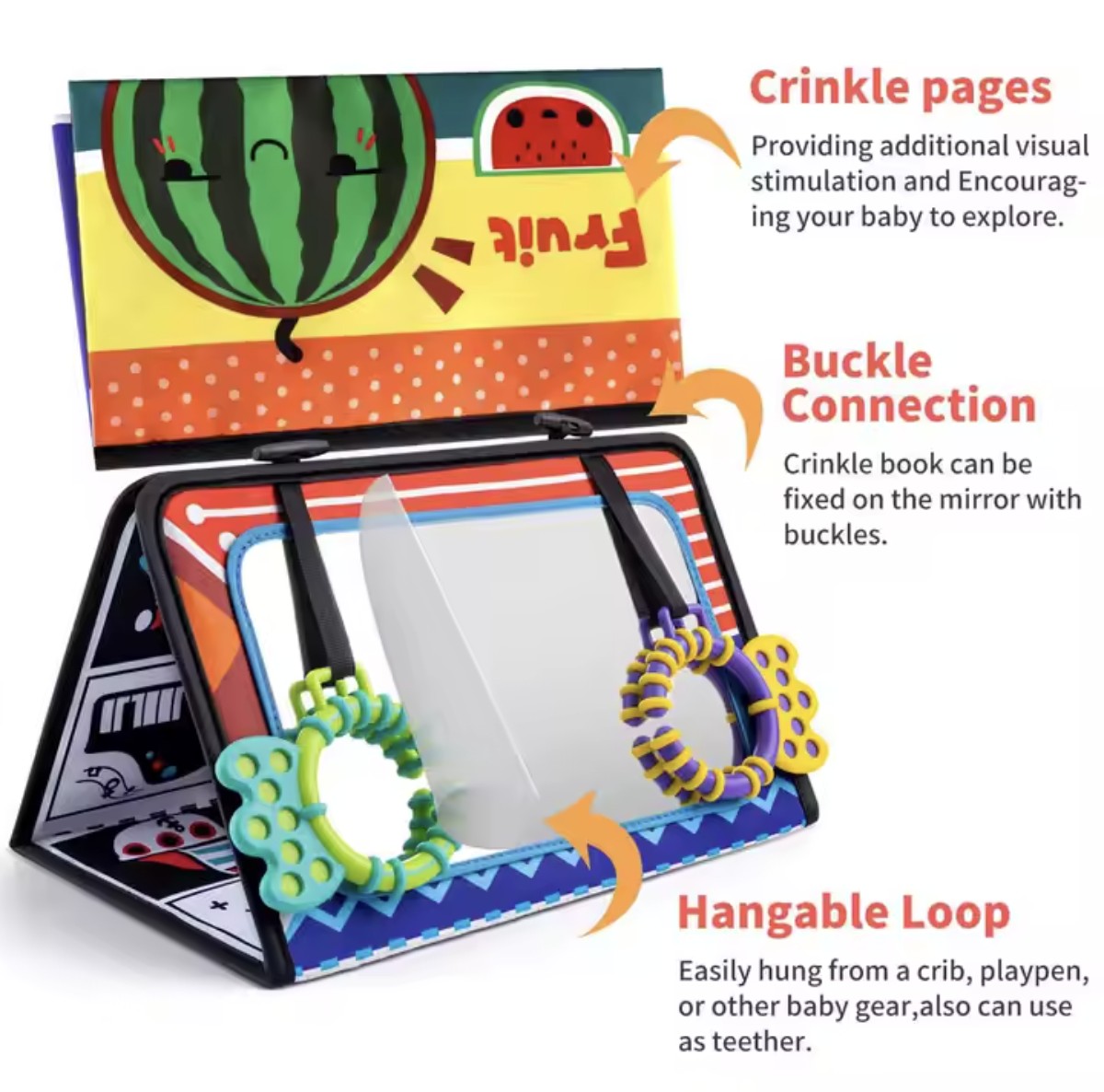 Este juguete de espejo para bebé en blanco y negro incluye un libro de tela, perfecto para que el bebé se divierta más con el libro y el espejo de piso mientras juega boca abajo. Este juguete ayuda a fortalecer los músculos del bebé al gatear y jugar.