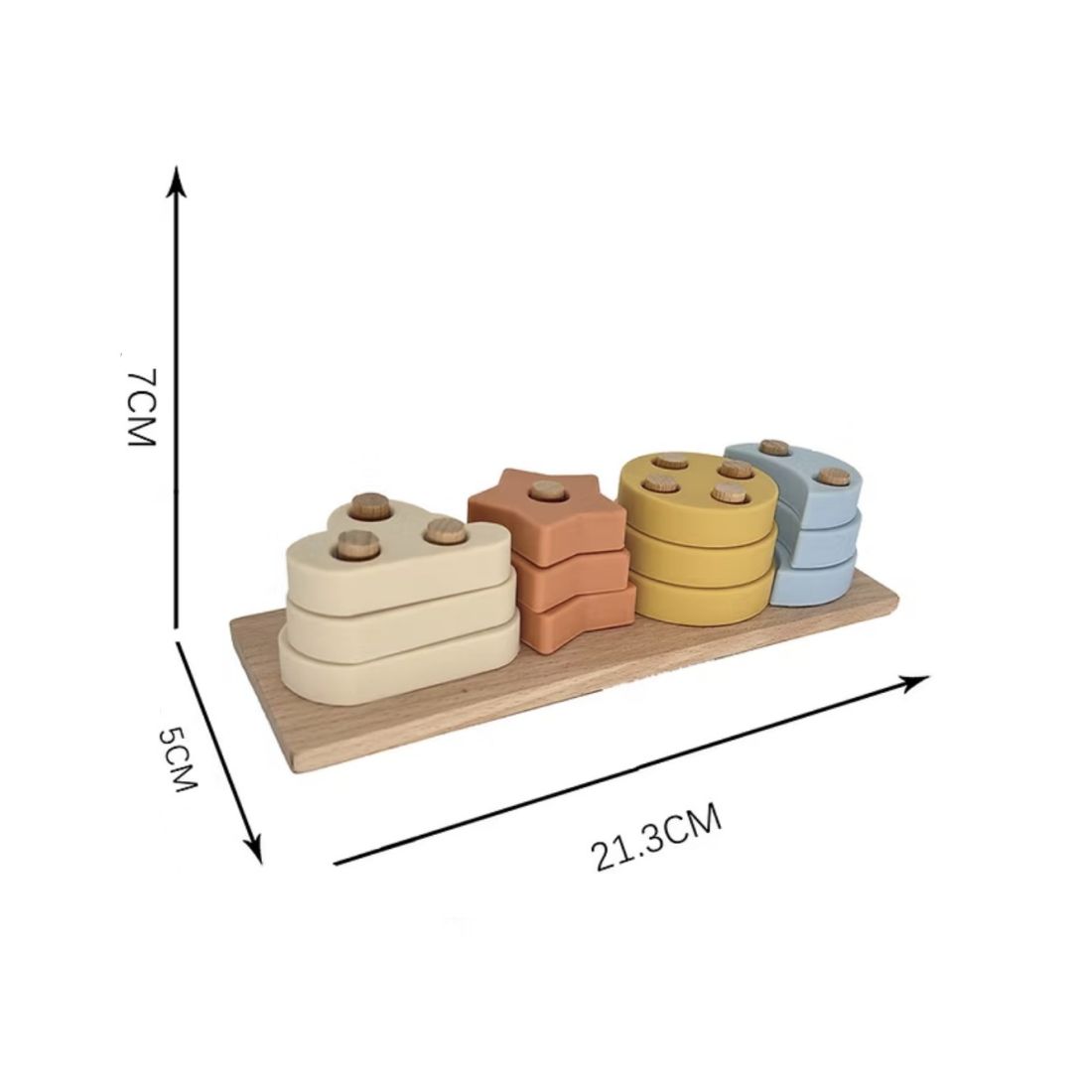 Un diseño que combina juego, aprendizaje y estética. Incluye base de madera y 12 piezas suaves para encastrar, apilar y explorar.